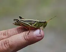 A relatively large species with sizes ranging from 30 to 55 mm.[4] A pair of pale yellow stripes running along the top of its body from above its eyes to the hind tip of its wings help to easily identify this species. This characteristic also gives this species its other common name the yellow-striped grasshopper.[4] The species also has a yellowish green coloration throughout its body due to chromoprotein and carotenoid.[5] The rest of the body looks similar to that of most grasshopper species, with enlarged hind legs for jumping and two pairs of wings, with one set overlapping the other.