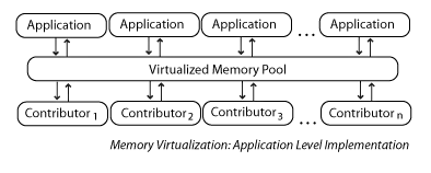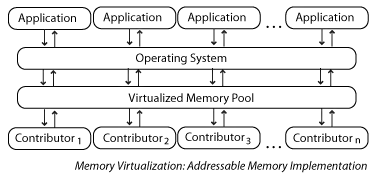 Cluster implementing memory virtualization. Contributors 1...n contribute memory to the pool. The operating system connects to the memory pool through the page cache system. Applications consume pooled memory via the operating system.
