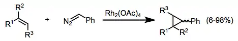 Metal-catalyzed cyclopropanations are chemical reactions that result in the formation of a cyclopropane ring from a metal carbenoid species and an alkene.[1] In the Simmons–Smith reaction the metal involved is zinc. Metal carbenoid species can be generated through the reaction of a diazo compound with a transition metal). The intramolecular variant of this reaction was first reported in 1961.[2] Rhodium carboxylate complexes, such as dirhodium tetraacetate, are common catalysts. Enantioselective cyclopropanations have been developed.[3]