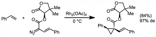 Chiral auxiliaries derived from readily available chiral alcohols (such as pantolactone) may be used for diastereoselective cyclopropanations with diazo esters.[10]