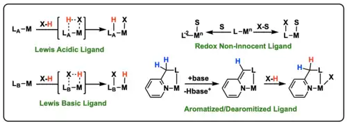 There are a variety of modes in which this cooperativity has been demonstrated. Four primary modes are generally accepted under MLC: the ligand can (1) act with Lewis acidity, (2) act with Lewis basicity, (3) play a role in aromatization and dearomatization, or (4) be redox non-innocent.[8]