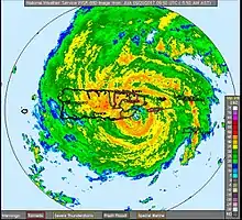 The hurricane made its closest approach to St. Croix at around 05:00 UTC on September 20, passing within 20 mi (30 km) of the island; the storm's outer eyewall lashed the island while the more violent inner eye remained offshore.[22] Three hours later, at around 08:00 UTC, the outer eyewall struck Vieques, an island off the eastern coast of Puerto Rico.[23] By this time, the outer eyewall became dominant as the inner one decayed, and the eyewall replacement cycle caused Maria to weaken to Category 4 strength.[24] Maria made landfall near Yabucoa, Puerto Rico, at 10:15 UTC, with winds of 155 mph (250 km/h) and a central pressure of 920 mbar (hPa; 27.17 inHg),[5] making it the strongest to hit the island since the 1928 San Felipe Segundo hurricane, which had struck Puerto Rico as a Category 5 hurricane.[25] Additionally, when Maria made landfall in Puerto Rico as a Category 4 storm, following the landfalls of Harvey and Irma, it marked the first time that three Category 4 hurricanes made landfall in the United States within a year, including unincorporated territories.[26]