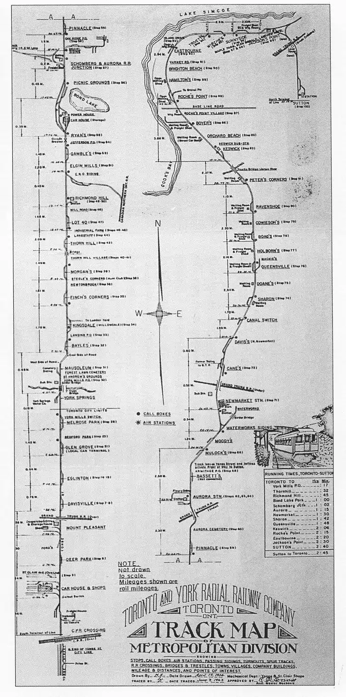 The Metropolitan line was a single-track radial line with passing loops. Between 1909 and 1914, the Metropolitan line was at its maximum length running from the CPR crossing at Yonge Street to Sutton. Here is a description of the line during that period.