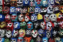Today, most mask use is related to celebrations and rituals, although modern images and new variations have entered modern popular culture. Traditional masks have been carved with images of figures such as Pedro Infante and Cantinflas.[20] The influence of Halloween from the United States has resulted in the appearance of commercially made masks for the days around Day of the Dead.[21] Masked characters appear in comics, television and movies such as El Chapulín Colorado and Karmatron. However, the most important uses of masks in Mexican popular culture are those associated with lucha libre, or professional wrestling.[22] Here, the mask is a symbol of the wrestler's professional identity. It is made of fabric and envelops the head as well as the face, with plastic reinforcement around the eyes and mouth. Designs are unique to each wrestler and they fight to defend this identity. A number of these masks have been passed down from father to son, such as those of El Santo, Blue Demon, Los Hermanos Dinamita, Tinieblas and Dos Caras. In the case of a bout called “lucha de apuestos” the loser loses his mask and his real face is revealed. After this, the mask can never be used again.[23]
