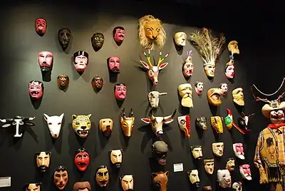 After the Mexican Revolution a number of aspects of traditional Mexican life became revalued, including traditional and rural handcrafts.[17] Today, masked festivals and dances are most prevalent in areas of the country with large concentrations of indigenous peoples.[18] Sophisticated masks made by saint makers still can be found in the states of Tlaxcala, Puebla, Oaxaca, Chiapas and Michoacán, but in most areas masks are made by lesser craftsmen.[18] Past history and customs live on in traditional dances. These include the Conquest, Independence, and the Battle of Puebla, using masked characters.[19]