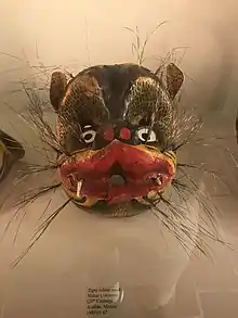 Another prominent animal is the jaguar or ocelot, often mislabeled as a “tiger” in the various dances that feature it. This character appears in Morelos, Puebla, Guerrero, Oaxaca, Chiapas and Tabasco in dances such as Tecuanes, Tlacololeros, Tejonrones, El Calalá or El Pochó. The behavior of this tiger character varies from fighting to being pursued by hunters, but the symbolism is most often related to the agricultural cycle and the rainy season on which it depends.[11][54][55] Tiger masks typically range from small to the size of the human face, with some far larger where the dancer looks out through the jaws.[52] The mask may cover only the face or be a leather or cloth helmet and complement a full costume.[54][56]