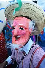 Dances with old men or women characters have dancers that are masked, with origins to the pre-Hispanic period.[57] These masked dancers may represent the elders of the village or the ancestors.[25] In the Valley of Mexico, an old man can represent the god of fire, Huehueteotl, especially in relation to the New Fire Ceremony.[25][58] In a version of the dance in Michoacán, the depiction of the elderly is dignified, with the Danza de los Viejitos performed on major days of the Catholic calendar, especially between Christmas and Candlemas.[25][58]