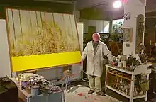 After theatre work in Manhattan, he moved into product and decorative design work. Only at the age of 36 did he realise that he had made the wrong career choice at the age of 15. He then decided that he had to be a professional painter and quickly moved from representative painting to abstraction. He was Artist in Residence at the Indiana State University (1978), giving master classes on advanced painting and lectures on colour theory.[3] In 1986, he gave up his New York studio and moved back to London. He set up a studio in the old Spratt's Dog Biscuit factory, where he began his first sculptures.