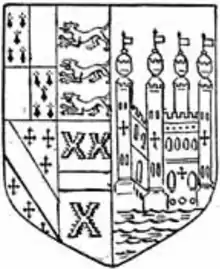 At some time before November 1537, Stanhope married Anne Rawson (c. 1515 – 20 February 1588), a daughter of Nicholas Rawson of Aveley in Essex, by his wife Beatrix Cooke (d. 14 January 1554), a daughter of Sir Philip Cooke (d. 7 December 1503) by his wife Elizabeth Belknap (died c. 6 March 1504).[12][13] Beatrix was the aunt of Sir Anthony Cooke. By his wife he had seven sons and four daughters as follows, as recorded in the inscription on her monument in St. Peter and St. Paul's Church, Shelford:[14][15][16]
