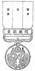 The China Incident Medal (支那事変従軍記章, Sina jihen jūgun kishō) medal was created by Imperial Edit No. 496 on July 27, 1939;[10] and was awarded for service in China at any time from the 12th through the 20th years of the Shōwa period -- Shōwa 12-20 (1937–1945).[11] An amendment was promulgated by Imperial Edict No. 418 in 1944; and the decoration was abolished in 1946 by government ordinance No. 177.[10]