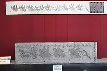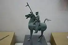 It's clear from surviving inventory lists in Gansu and Xinjiang that the crossbow was greatly favored by the Han dynasty. For example, in one batch of slips there are only two mentions of bows, but thirty mentions of crossbows.[36] Crossbows were mass-produced using material such as mulberry wood and brass; a crossbow in 1068 could pierce a tree at 140 paces.[37] Crossbows were used in numbers as large as 50,000 starting from the Qin dynasty and upwards of several hundred thousand during the Han.[38] According to one authority the crossbow had become "nothing less than the standard weapon of the Han armies" by the second century BC.[39] Han era carved stone images and paintings also contain images of horsemen wielding crossbows. Han soldiers were required to pull an "entry level" crossbow with a draw-weight of 76 kg/168lb to qualify as an entry level crossbowman,[40] while it was claimed that a few elite troops were capable of bending crossbows by the hands-and-feet method, with a draw-weight in excess of 340 kg/750lb.[41][42]
