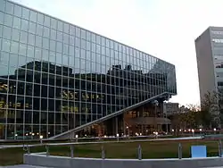 Started in 2003[15] and completed in 2005, the $21-million[16] redevelopment of the Centennial Library involved the addition of 3,700 square metres (40,000 sq ft) of new space, construction of a new fourth floor, and renovations throughout the existing 10,000-square-metre (110,000 sq ft) library.[2] The library now features a new Reading Terrace with a four-storey high solar glass wall, positioned alongside a new grand staircase, along with two new glass elevators,[2] and a passive solar wall on the southeast face of the building.[15]