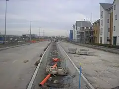 On the eastern flank, the first area to be built on will be 'Broughton Gate' (bounded by Broughton, Kingston and the A5130). This will include an extension to the H7 Chaffron Way grid road as far as the A5130, but will not go further and join the Salford Road (with its M1 crossing), thus impeding any further expansion east of the M1.[6] (The plan actually proposes that Salford Road be downgraded to a Redway, closing it to other traffic. A second M1 crossing, Broughton Grounds Lane, is ignored completely – though in the planning application for the enabling infrastructure, the existence of the lane has been reinstated.[7]) After this the area to the east of the A5130 as far as the M1 motorway and bounded on the south by the A421 will be developed in parts as a residential and industrial estate. The H7 will again extend east through this area, as a city street, turning south upon meeting another city street and meeting the A421. Along the A421 a new employment complex named 'Nova' is planned. Whilst acknowledging the benefit of the grid system, the plan explicitly rules out any role for the former A5130 as a V12 grid route and the development map shows that HGVs will not be permitted to use it.[8]