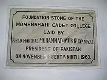 The then president of Pakistan Field Marshal Ayub Khan laid the foundation stone of Momenshahi Cadet College at the Mirzapur Upazila in the then Mymensingh District (now Tangail district) of Bangladesh on 29 November 1963. The foundation stone is still there on the wall of the main academic building of the college.