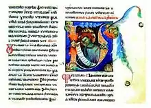The missal itself was written in Croatian recension of the Church Slavonic language, in the Croatian angular Glagolitic script and quite possibly illuminated, by the royal knight Novak Disislavić on his estates in Krbava in 1368. The author's family descended from the Mogorović gentis, which at that time belonged to the medieval institution Nobiles duodecim generationum regni Croatiae.[1] He was also named the duke of Šolgov in Hungary and duke of Nin in Dalmatia. The missal was written as a pledged gift to a church, where he was to be buried after death.[2]