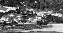 In the winter of 1955, immediately after construction of the Theater, MRA workers began building the Great Hall complex at Mission Point (64,732 ft2[24]). It was to serve as a convention center and residence hall for summer MRA meetings. It surrounded Cedar Point cottage and included a tepee-shaped Great Hall, lobbies, porches, kitchens, dining rooms, meeting rooms, and residence halls (48,330 ft2[24]) named “building A” and “building B” (250 beds in 150 rooms). Cedar Point cottage was eventually torn down, and the Great Hall complex was dedicated on September 24, 1956. A three-story connector between buildings A and B was added during the winter of 1958. Many of the floors of the Great Hall complex are heated, and the complex accommodates 1000 people.[15]