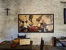 One year later Serra himself, along with Amúrrio and Pablo de Mugártegui, took up work on the Mission at San Juan Capistrano; the contingent, accompanied by eleven soldiers, arrived on October 30 or 31, 1776.[35] Upon their return to the site today known as "Mission Vieja," the party excavated the bells and constructed a new arbor; the original wooden cross was, to their surprise, still standing.[36] Serra celebrated High Mass in thanksgiving on November 1, 1776—celebrated ever since as the official founding date.[37] Due to an inadequate water supply the Mission site was subsequently relocated approximately three miles to the west less than 60 yards from the village of Acágcheme.[38][15][14] The new venue was strategically placed above two nearby streams, the Trabuco and the San Juan. Mission San Gabriel provided cattle and neophyte labor to assist in the development of the new Mission. Amúrrio performed the Mission's first baptism on December 19 of that year[39] (a total of 4,639 souls were converted at the Mission between 1776 and 1847.[40]) The first Indian marriage was blessed by Mugártegui on the feast of the "Espousals of the Blessed Virgin Mary," January 23, 1777. Mugártegui also presided over the first burial ceremony on July 13 (the first burial on Mission grounds would not take place until March 9, 1781).[41] The Registers of Baptisms, Marriages, and Burials are all intact and preserved at the Mission, as is the Confirmation Register (San Juan Capistrano is one of the few Missions to have retained this document). Serra visited the Mission for the first time since its founding and administered the Sacrament of Confirmation on October 22.[42] In 1778, the first adobe capilla (chapel) was blessed. It was replaced by a larger, 115-foot (35 m) long house of worship in 1782, which is regarded as the oldest standing building in California. Known proudly as the "Serra Chapel," it also has the distinction of being the only remaining church in which Serra is known to have officiated ("Mission Dolores" was still under construction at the time of Serra's visit there). Serra presided over the confirmations of 213 people on October 12 and 13, 1783; divine services are held there to this day. By the time of the chapel's completion, living quarters, kitchens (pozolera), workshops, storerooms, soldiers' barracks (cuartels), and a number of other ancillary buildings had also been erected, effectively forming the main cuadrángulo (quadrangle).