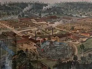 The town was planned by a company architect/engineer with a main street that had the company store, a hospital, hotel and other commercial buildings, surrounded by large lawns and decorative landscaping. Residential streets were laid out for up to 1000 houses. Just outside of town were a railway roundhouse, blacksmith and other machine shops. Between the town and the mills on the east was an 80 acres (32 ha) lumberyard.[3] The headquarters building was the town's financial center where employees were paid monthly on the tenth. It had a vault and teller booth.[lower-alpha 2][5]