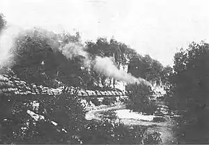 The company then turned its attention to Carter County, where its holding had grown to 100,000 acres (40,000 ha) with additional acreage in adjacent Ripley County. It identified a desirable mill location and sought the needed rail access. The company made a distribution deal with the Kansas City, Fort Scott and Memphis Railway (KFS&M).[3] The KFS&M had already built a line from Springfield to Thayer in 1882. The railroad agreed to construct an 81 mi (130 km) spur from this line running from Willow Springs, Missouri to MLMs land in the Current River Valley in exchange for a guaranteed minimum amount of lumber shipments. A five-year agreement between the companies in February 1887 specified that MLM would ship all its lumber going west of the Mississippi on the KFS&M or its affiliates. The MLM also agree to have a mill operational by the time the line was complete.[3] The spur, organized as the Current River Railroad was completed in 1888.[3] Later that year, the Cape Girardeau Southwestern Railroad extended a line from the east allowing the mill to more directly supply eastern markets as well.[2] The Cape Girardeau line met the Current River line in Hunter, Missouri, about 5 mi (8.0 km) from the Current River terminus at the MLM mill site.[3]