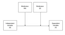 In statistics and regression analysis, moderation (also known as effect modification) occurs when the relationship between two variables depends on a third variable. The third variable is referred to as the moderator variable (or effect modifier) or simply the moderator (or modifier).[1][2] The effect of a moderating variable is characterized statistically as an interaction;[1] that is, a categorical (e.g., sex, ethnicity, class) or continuous (e.g., age, level of reward) variable that is associated with the direction and/or magnitude of the relation between dependent and independent variables. Specifically within a correlational analysis framework, a moderator is a third variable that affects the zero-order correlation between two other variables, or the value of the slope of the dependent variable on the independent variable. In analysis of variance (ANOVA) terms, a basic moderator effect can be represented as an interaction between a focal independent variable and a factor that specifies the appropriate conditions for its operation.[3]