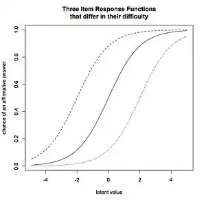 The Double Monotonicity model adds a fourth assumption, namely non-intersecting Item response functions, resulting in items that remain invariant rank-ordering.[11] There has been some confusion in Mokken scaling between the concepts of Double Monotonicity model and invariant item ordering.[12] The latter implies that all respondents to a series of questions all respond to them in the same order across the whole range of the latent trait. For dichotomously scored items, the Double Monotonicity model can mean invariant item ordering; however, for polytomously scored items this does not necessarily hold.[13] For invariant item ordering to hold not only should the item response functions not intersect, also, the item step response function between one level and the next within each item must not intersect.[14]