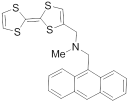 This molecular logic gate illustrated demonstrates the advancement from redox-fluorescent switches to multi-input logic gates with an electrochemical switch. This two-input AND logic gate incorporates a tertiary amine proton receptor and a tetrathiafulvalene redox donor. These groups, when attached to anthracene, can simultaneously process information concerning acid concentration and oxidizing ability of the solution.[12]