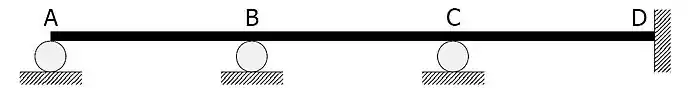 The beam is considered to be three separate members, AB, BC, and CD, connected by fixed end (moment resisting) joints at B and C.