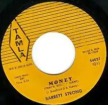 In the US, the single became Motown's first hit in June 1960, making it to number two on the Hot R&B Sides chart and number 23 on the Billboard Hot 100.[7] The song was listed as number 288 on Rolling Stone's "The 500 Greatest Songs of All Time". Greil Marcus has pointed out that "Money" was the only song that brought Strong's name near the top of the national music charts, "but that one time has kept him on the radio all his life."[8]