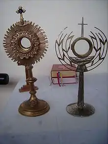 A monstrance, also known as an ostensorium (or an ostensory),[1] is a vessel used in Roman Catholic, Old Catholic, High Church Lutheran and Anglican churches for the display on an altar of some object of piety, such as the consecrated Eucharistic Sacramental bread (host) during Eucharistic adoration or during the Benediction of the Blessed Sacrament. A monstrance may also serve as a reliquary for the public display of relics of some saints.[2] The word monstrance comes from the Latin word monstrare,[3] while the word ostensorium comes from the Latin word ostendere. Either term, each expressing the concept of "showing", can refer to a vessel intended for the exposition of the Blessed Sacrament, but ostensorium has only this meaning.[2]