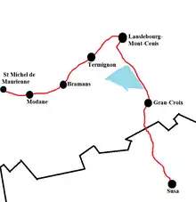 The Mont Cenis Pass Railway operated from 1868 to 1871 (with some interruptions) during the construction of the Fréjus Rail Tunnel through the Alps between Saint-Michel-de-Maurienne, southeast France and Susa, Piedmont, northwest Italy. It was designed by John Barraclough Fell and his three-rail design was used on some other mountain railways. The railway was 77 kilometres (48 miles) long, with a gauge of 1,100 mm (3 ft 7+5⁄16 in). The height at the summit was 2,283 metres (7,490 ft) and the maximum gradient was 9 per cent (1 in 11).[1] It was used to transport English mail to India as part of the 1,400-mile (2,300 km) All Red Route.[2]