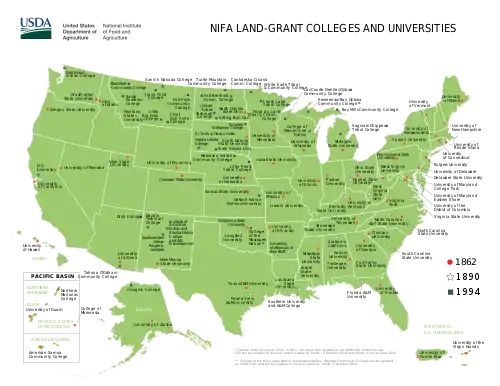 The Morrill Land-Grant Acts are United States statutes that allowed for the creation of land-grant colleges in U.S. states using the proceeds from sales of federally owned land, often obtained from Native American tribes through treaty, cession, or seizure. The Morrill Act of 1862 (12 Stat. 503 (1862)[1] later codified as 7 U.S.C. § 301 et seq.) was enacted during the American Civil War, and the Morrill Act of 1890 (the Agricultural College Act of 1890 (26 Stat. 417, later codified as 7 U.S.C. § 321 et seq.)) expanded this model.