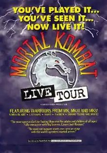 Mortal Kombat: Live Tour was a martial art theatrical stage show featuring Mortal Kombat characters, sound, and laser light effects on stage. The plot was based on three fighters rescuing their friends and retrieving a magic amulet from the evil master of Outworld, Shao Kahn, in order to save the Earth.
