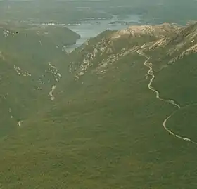 ![]() Aerial photograph of lower slopes of Mount Huxley (to the left), King River gorge in the left lower, Crotty Dam and Lake Burbury (to the rear), northern slopes (that is Proprietary Peak) of Mount Jukes on the right, Mount Jukes Road in right foreground, and to the right rear the different coloured upper part of East Jukes Peak. | |