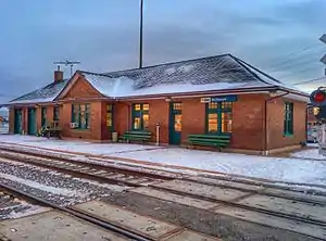 Mount Pleasant station is an Amtrak intercity train station in Mount Pleasant, Iowa. The Chicago, Burlington and Quincy Railroad built the pressed brick depot in 1912.[2] The contractors were J. Louis Whitney and K.A. Bergdah, two prominent Mt. Pleasant builders at that time. Using funds received under the American Recovery and Reinvestment Act of 2009, Amtrak installed a new wheelchair lift and enclosure at the station in 2010.[3]