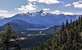 Mount Sloan is the sixth-highest peak in the Thiassi Range which is a subrange of the Coast Mountains.[1] The remote mountain is situated 50 km (31 mi) north of Pemberton and 11 km (7 mi) west of the historic gold-mining community of Bralorne. Precipitation runoff from the peak drains north to Downton Lake which is a reservoir of the Bridge River. Mount Sloan is more notable for its steep rise above local terrain than for its absolute elevation as topographic relief is significant with the summit rising over 1,960 meters (6,430 ft) above Downton Lake in 5 km (3.1 mi). Mount Penrose rises to the north on the opposite side of the lake.
