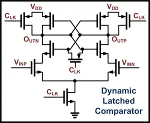 A continuous comparator will output either a "1" or a "0" any time a high or low signal is applied to its input and will change quickly when the inputs are updated. However, many applications only require comparator outputs at certain instances, such as in A/D converters and memory. By only strobing a comparator at certain intervals, higher accuracy and lower power can be achieved with a clocked (or dynamic) comparator structure, also called a latched comparator. Often latched comparators employ strong positive feedback for a "regeneration phase" when a clock is high, and have a "reset phase" when the clock is low.[33] This is in contrast to a continuous comparator, which can only employ weak positive feedback since there is no reset period.