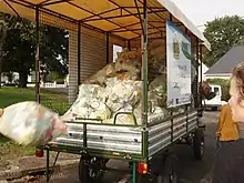 The use of horses for waste collection can have many applications, including collecting household waste and special waste from the selective sorting process (such as batteries, glass and cardboard), the collection of garbage cans and litter garbage cans in streets and parks, and even steel, aluminium and plastic. The presence of the horse makes it easier to communicate with the public about waste sorting and management. As a result, the volumes recovered are often greater. The horse-drawn carriage also enables more effective door-to-door collection from both private and professional customers. There are also seasonal collection schemes, such as at Christmas markets[18] or for used Christmas trees.[19] Horse-drawn vehicles are seen as a more effective way of raising awareness, especially among children. This practice also enhances the visibility of the individual responsible for collecting waste. Furthermore, some reports indicate that workers are more driven and productive when working with horses. Problems encountered with vehicle traffic are considered to be just as, if not less, restrictive than with a truck. Lastly, horses are more efficient at negotiating very narrow or steep streets, and at working short distances with frequent stops.[18] On the other hand, public acceptance of the use of horses in this context is lower, with 72% of French people saying they are opposed (Kantar TNS poll, 2003). Local authorities are also encountering problems in adapting staff and equipment.[18]