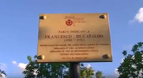 - 1 2 3 4 "Milano onora il barlettano Francesco Di Cataldo, ucciso dalle brigate rosse" [Milan honors Francesco Di Cataldo from Barletta, killed by the Red Brigades] (in Italian). BarlettaViva. 28 April 2013. Retrieved 6 September 2021.