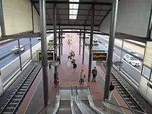 Bus transfers are available on the concourse level. The bus station is situated on a bridge structure extending over the Kwinana Freeway and railway station.[5] Traffic signals at both ends of the bridge include a bus phase.