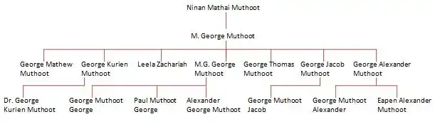 The Muthoot family is one of the foremost business houses in South India. The family has interests in various sectors of business varying from financial services to media. The founder of the Muthoot Group was M.N. Mathai (who goes by N. Mathai Muthoot), from whom the business house was later taken over by his son, M. George Muthoot,. The family traces its roots to Thevervelil Family in the small town of Kozhencherry in Central Travancore.[1]
