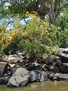 Myrciaria dubia, commonly known as camu-camu, caçari, araçá-d'água, or camocamo, is a species of plant in the family Myrtaceae. It is a small bushy riverside tree from the Amazon rainforest in Peru and Brazil, which grows to a height of 3–5 m (9.8–16.4 ft) and bears a red/purple cherry-like fruit. It is a close relative of the false jaboticaba (Myrciaria vexator) and the guavaberry or rumberry (Myrciaria floribunda). As much as 2 to 3% of the fresh fruit by weight is vitamin C.