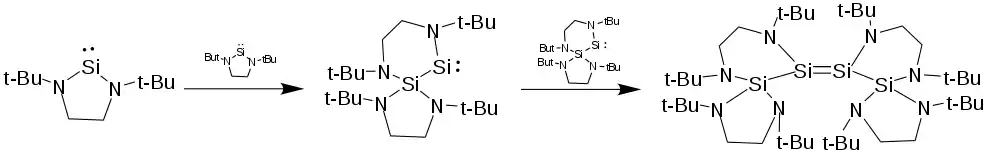 In concentrated solutions, the saturated unsubstituted silylene [tBuN−CH2CH2−tBuN]Si: reacts with itself to form a tetramer with a Si-Si double bond. First one NHSi inserts its divalent silicon into another's N-Si bond, creating a bicyclic molecule with a tetravalent silicon bonded to a divalent silylene. The mixed-valent dimer then itself dimerizes, forming a four-silicon silene with 229 pm Si=Si double bond. Though exceptionally long, the bond order is supported by Raman spectroscopy. Reacting the tetramer with methanol results in the mixed valent-dimer-methanol adduct and not the silene-dimer adduct (see below). Additionally a double bond between tert-butyl substituted NHSis is calculated to not be stable, further corroborating the identity of the mixed valent dimer as the intermediate.[11] Unsaturated and backbone-substituted saturated NHSis such as the 4,5-dimethyl-[tBuN−CHMeCH−tBuN]Si: are not reactive in this way and as remain monomers.[12] Similarly, the unsubstituted NHSis will react with analogous N heterocyclic germylenes, ultimately forming a silicon-flanked germene.[3]