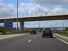 At Newlands Cross a flyover and exit slip roads replaced the at-grade signal-controlled crossing in November 2014.[1] This eliminated the last signal-controlled crossing on the N7/M7 route between the M50 and Limerick. Traffic for Clondalkin to the north and Tallaght to the south leave the N7 by slip roads connecting to the R113. The N7 continues southwards to bypass Citywest, Saggart, Rathcoole, Kill and Johnstown in County Kildare. These locations are all served with grade-separated interchanges which were constructed as part of the upgrade works completed in the mid-2000s. The old junctions consisted of traffic lights with a break in the dual-carriageway median. The three-lane section used to end at junction 9 (Naas, Sallins) with a left-hand lane-drop/lane-gain for traffic leaving/entering here.