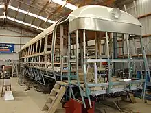 Originally, the Wairarapa railcars had wooden internal framing covered with steel sheathing. RM 5's body had decayed so far the decision was made to replace the original wooden framing with steel. This improves the railcar's crashworthiness, quite apart from being less maintenance-intensive. Restoration of RM 5 was completed in 2017 after an effort spanning 26 years.[6]