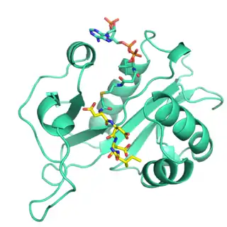Naa80 is a member of the GNAT family of acetyltransferases.[8] It has an overall fold similar to the other N-terminal acetyltransferases, but has a more open, basic active site to accommodate the acidic N-terminus of actin. Naa80 can acetylate peptides with different N-terminal residues, but the presence of acidic residues in positions 2 and 3 is important for substrate specificity.[8][7] Most Naa80 orthologs have an extended polyproline loop which may be important for actin binding through profilin.[6][8]