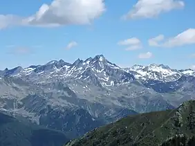 The Napfspitze (3,144 m s.l.m., also called the Dreiecketer, Italian: Cima Cadini), is a peak on the main chain of the Zillertal Alps and on the border between the Austrian federal state of Tyrol and the Italian province of South Tyrol.