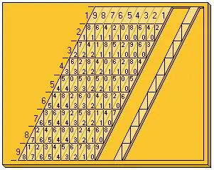 During the 19th century, Napier's bones were transformed to make them easier to read. The rods were made with an angle of about 65° so that the triangles that had to be added were aligned. In this case, in each square of the rod the unit is to the right and the ten (or the zero) to the left.
