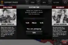 Every five turns, there is an election during which the player is able to pledge money to one of the two candidates. 'Arturo Herrera' the pro-war candidate who is initially stronger in the polls, provides an attack bonus on winning. 'Miguel Moralas' intends to instigate legalization of the drugs market, the game's dynamic changes dramatically when he comes into power as the street price will consistently drop meaning the cartels can no longer make as much money from the drugs trade.