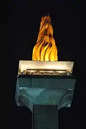 Monas is topped by a 14.5 ton bronze Flame of Independence containing the lift engine. The base of the flame, in the shape of a goblet, is 3 metres high. The bronze flame structure measures 14 metres in height and 6 metres in diameter, It consists of 77 sections. Originally the bronze flame structure was covered with 35 kg[2] of gold leaf. For the 50th anniversary of Indonesian independence in 1995, the gold leaf was reapplied and increased to 50 kg[10] of gold.