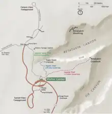 Betatakin means "House Built on a Ledge" in Navajo. In Hopi, the name of the place is Talastima, or "Place of the Corn Tassel".[7] Betatakin is smaller than nearby Keet Seel, with about 120 rooms at the time of abandonment. However, like Keet Seel, Betatakin was constructed of sandstone, mud mortar, and wood. Today only about 80 rooms remain, due to rock falls inside the alcove. Betatakin only has one kiva,[6] whereas Kiet Siel has several. Betatakin was built in an enormous alcove, measuring 452 feet (138 m) high and 370 feet (110 m) across, between 1267 and 1286[8]